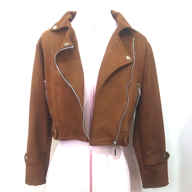 Elegante chaqueta corta de tela suave tipo durazno para dama, con accesorios y cierre metálicos.