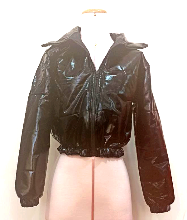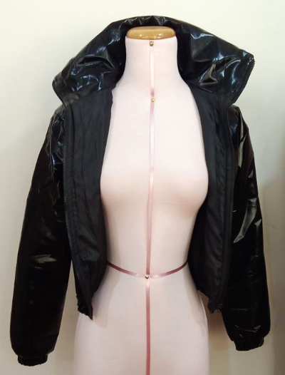Casaca corta puffer discotheque color negro brillante con cierre y forro interior acolchado.