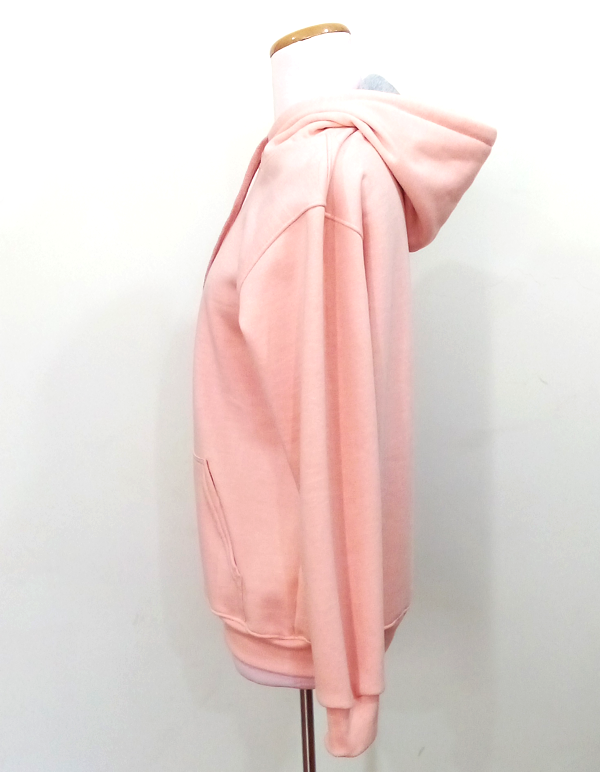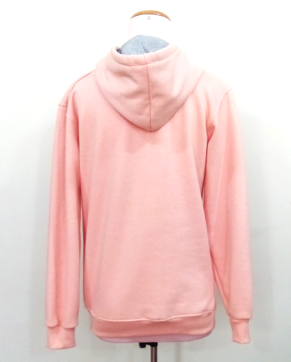 Abrigadora polera de algodón color rosado para dama con capucha y bolsillos.