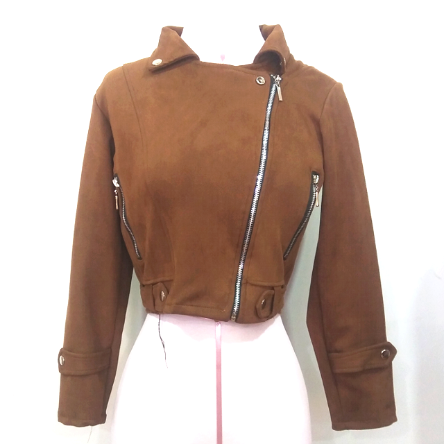 Elegante chaqueta corta de tela suave tipo durazno para dama, con accesorios y cierre metálicos.
